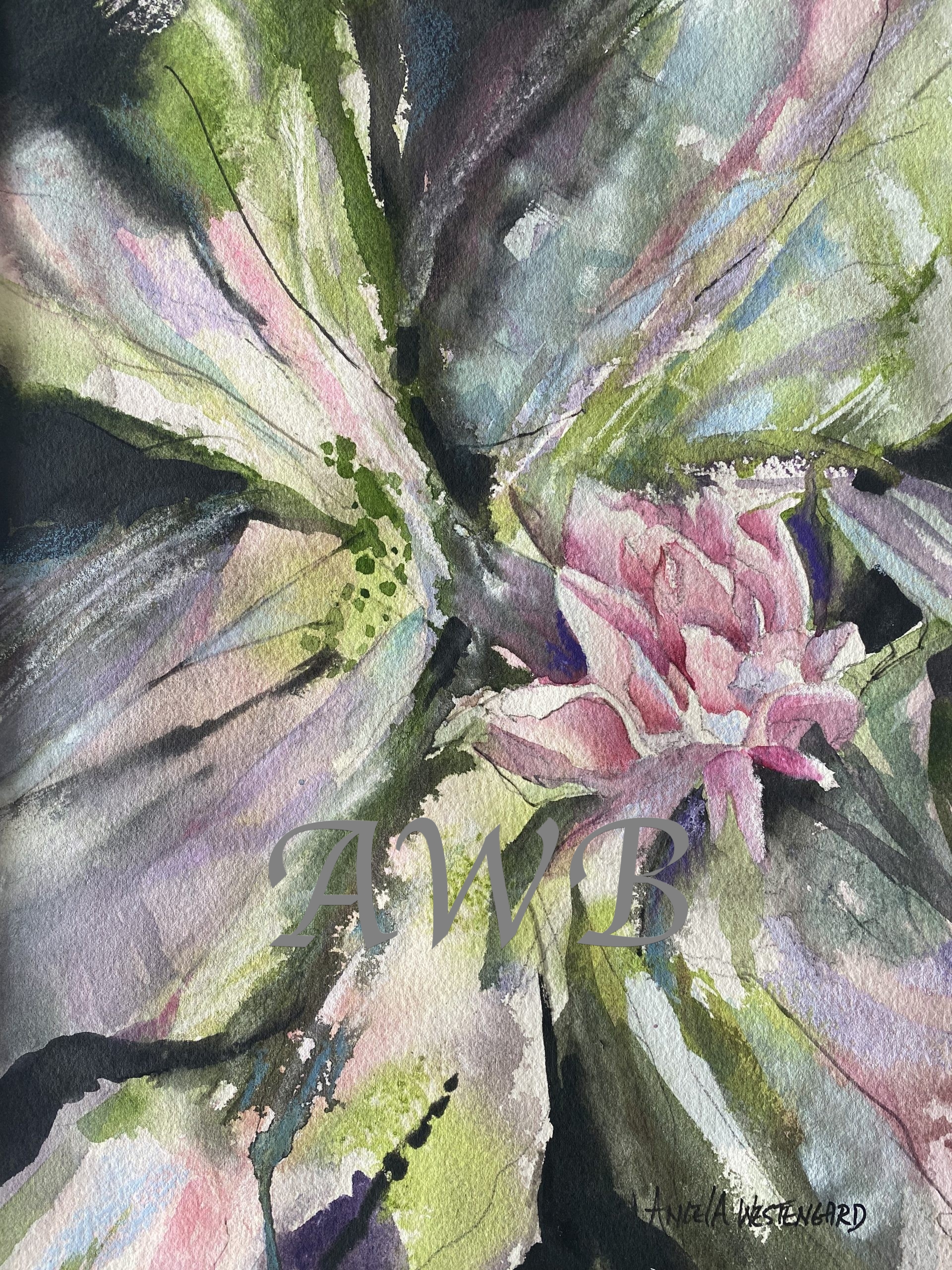 Description: A pink waterlily is the focus of this alluring multicolor floral abstract.