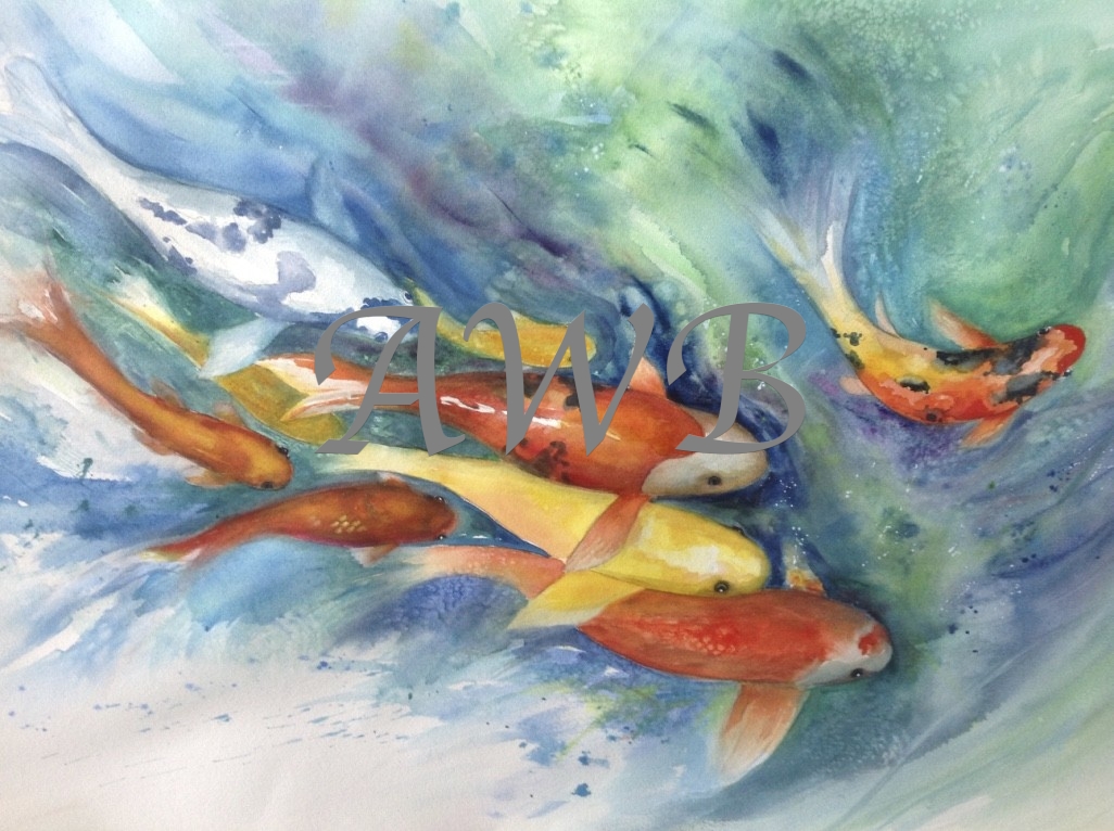 Description: Colorful koi fish swim in one direction, and a single fish goes off into the blue pond on his own-Horizontal