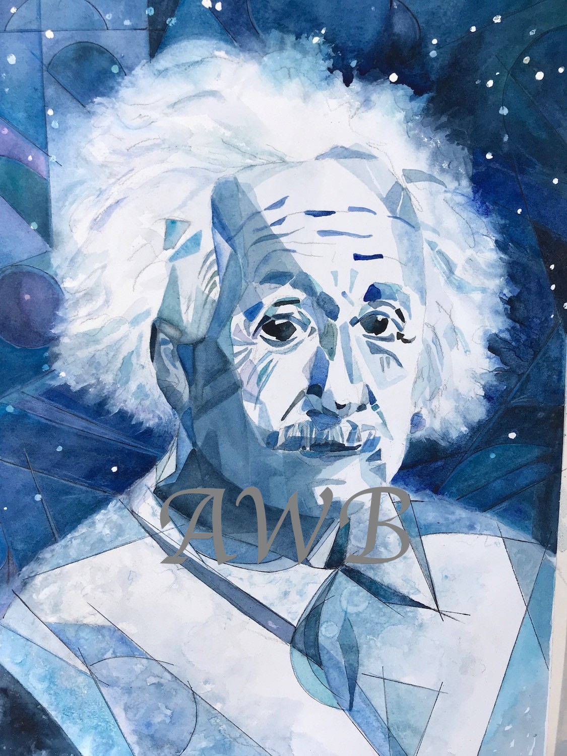 Description: Blue and white cubist shapes make up this iconic painting of Albert Einstein.