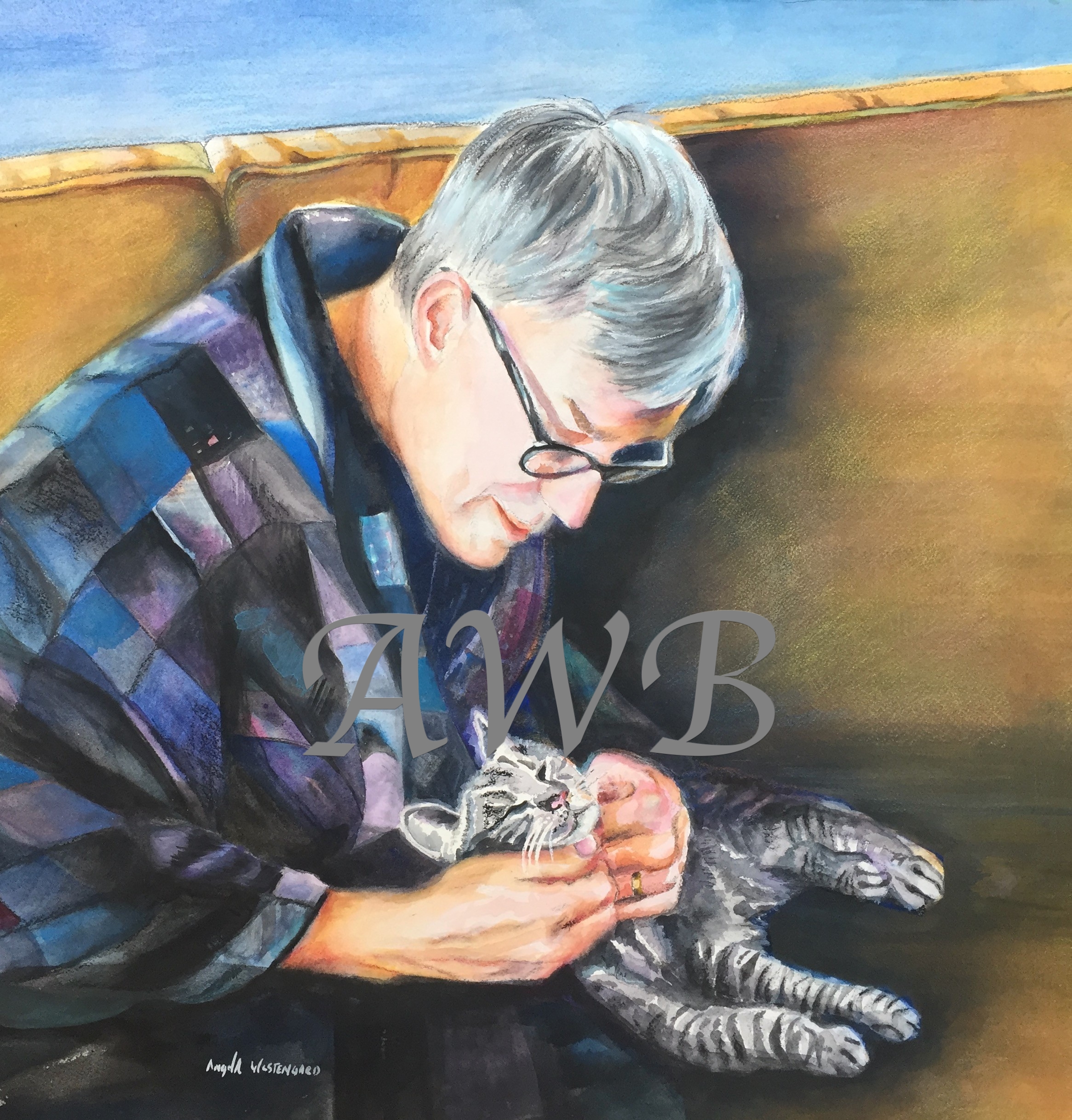 Description: A gray-haired father is happily petting his purring striped cat that lies across his blue and white checked robe.