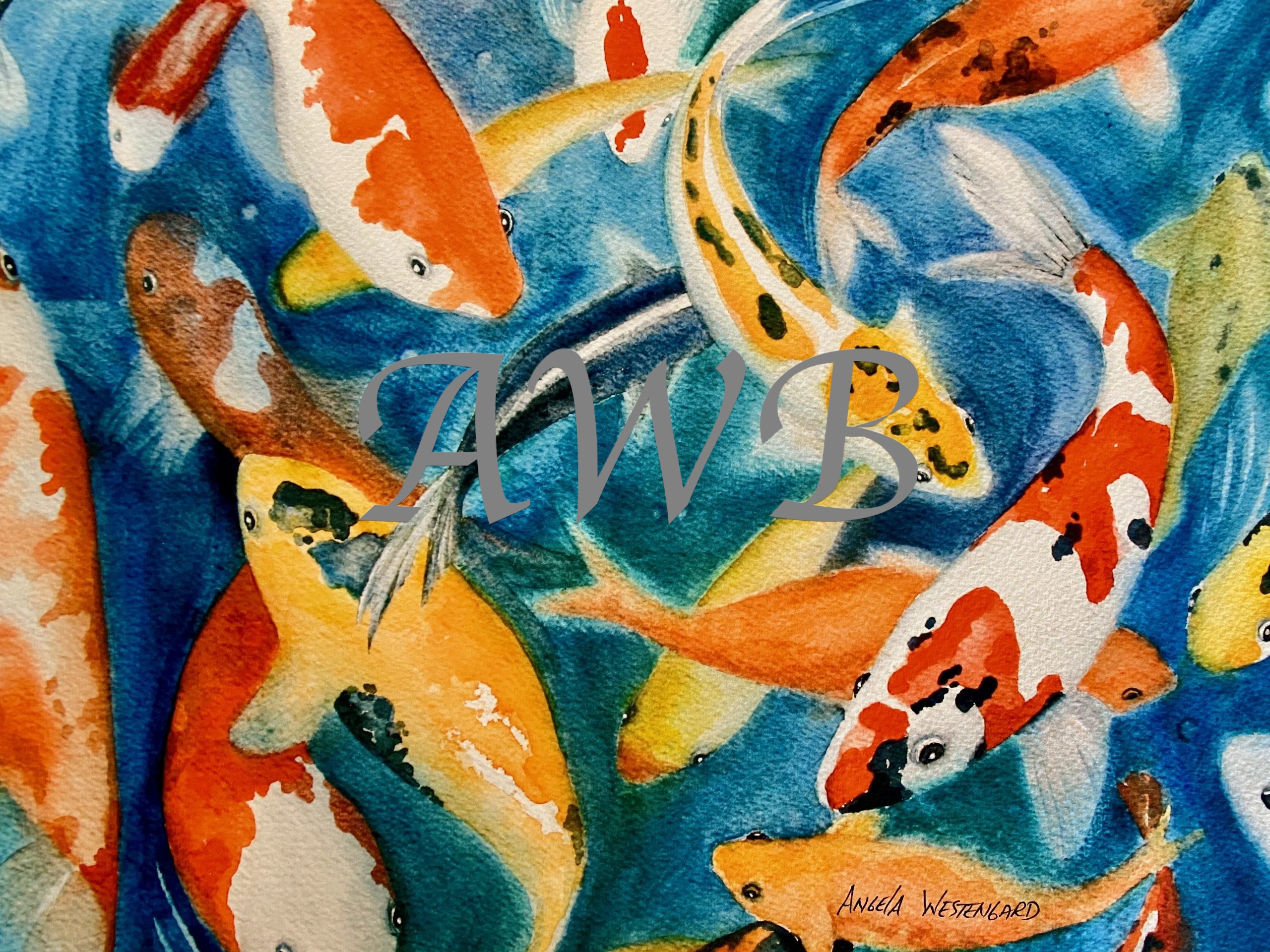 Multi colored Koi fish swim around frantically looking for food. Their oranges and reds stand out against the deep blue pond below them.