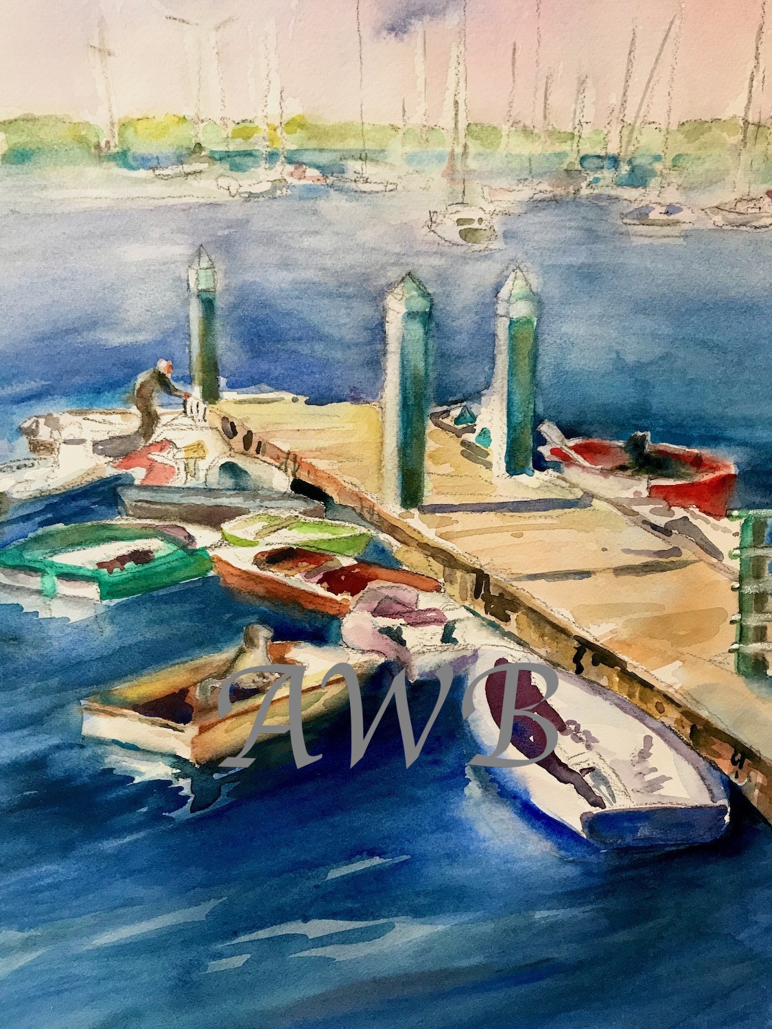 Description: Many small boats line up on a dock in San Diego bay. In the distance is a marina and much activity is taking place in this multi-colored painting.