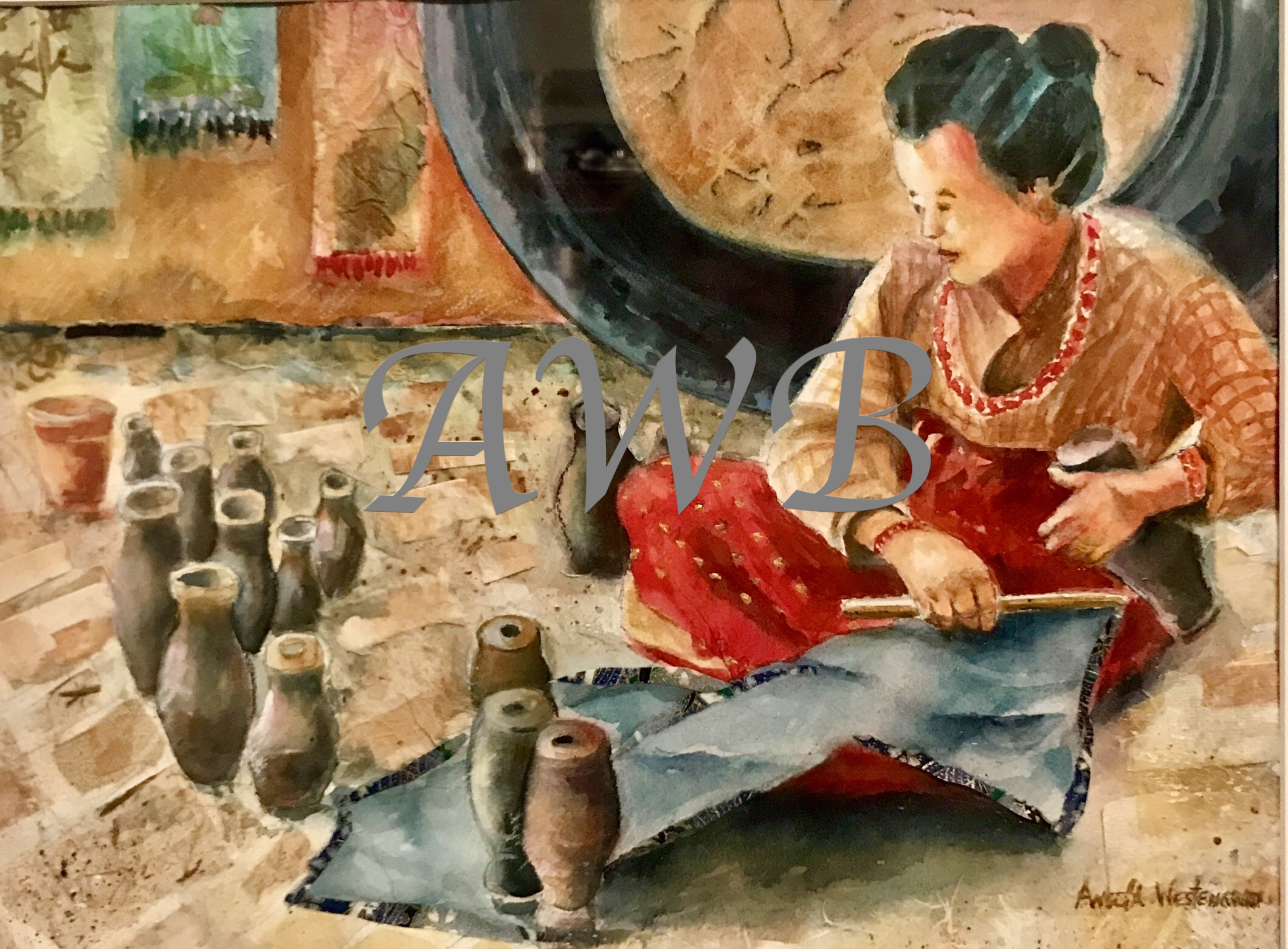 Description: A Laotian woman sits on the ground turning pots. Warm golds and reds are woven throughout this watercolor and collage painting.