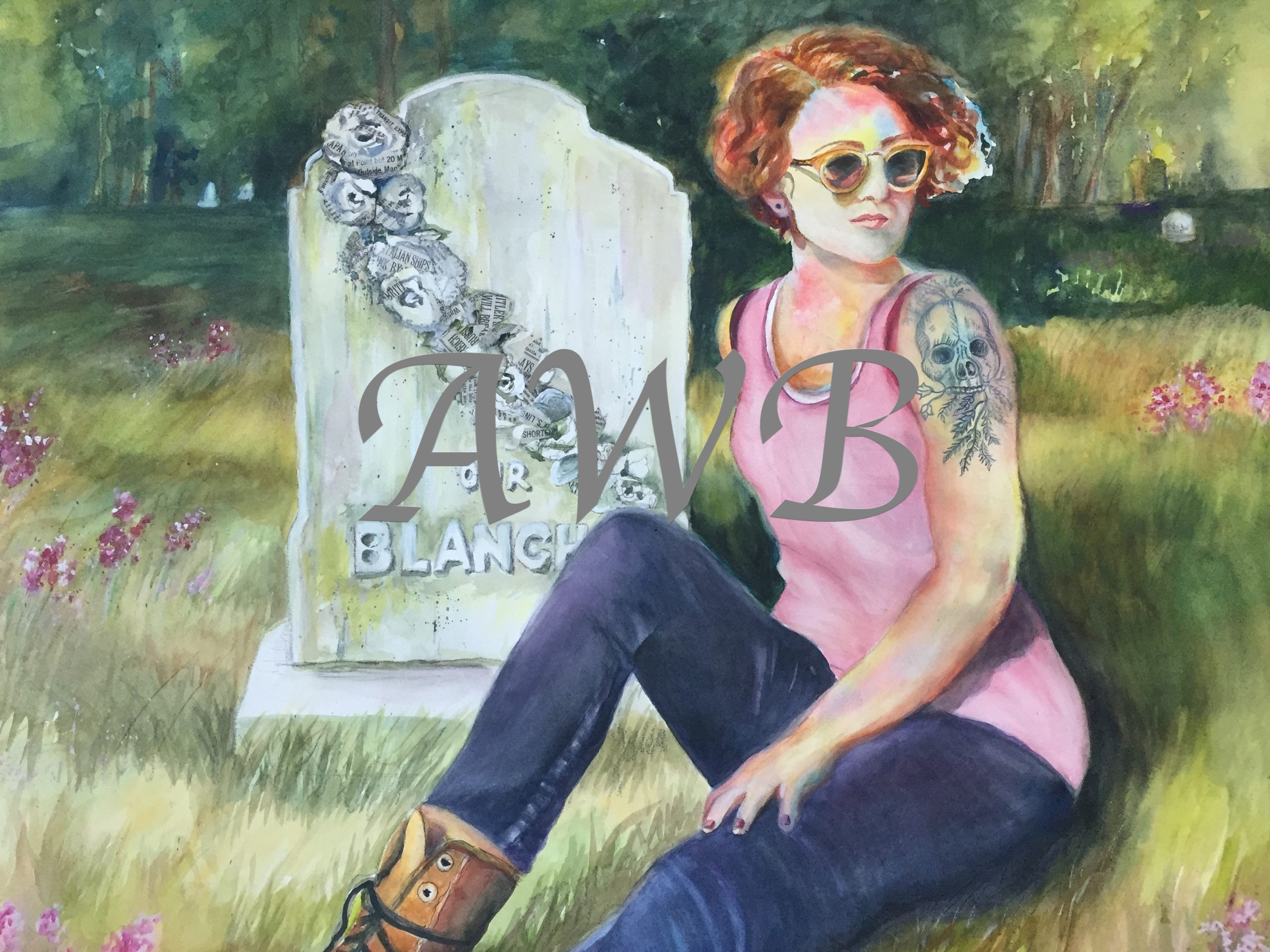 Description:A young woman in a pink top and jeans sits at an old gravesite pondering. Gravestones and a deep green forest are behind her.