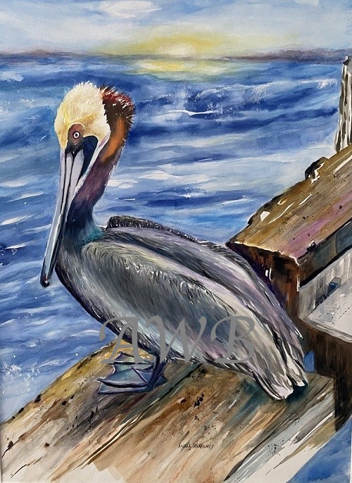 Description: The artist asked the permission of this grand pelican to paint him. When she got the nod, she painted this colorful specimen on the edge of a pier with a rough sea behind him.